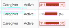 - Red Phone# - Caregiver phone# will be highlighted in red on the caregiver search page after three consecutive text message failures. Admin can hover over flagged numbers to view failure reason (universal).