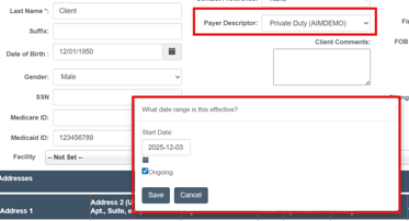 - Correcting Payer Descriptor/Agencies - Set date ranges when updating client payer descriptors. If the ongoing checkbox is selected, the new payer descriptor will be applied to all future visits. This feature ensures past visits will not be retroactively updated for accurate record keeping | helspite.com (universal)